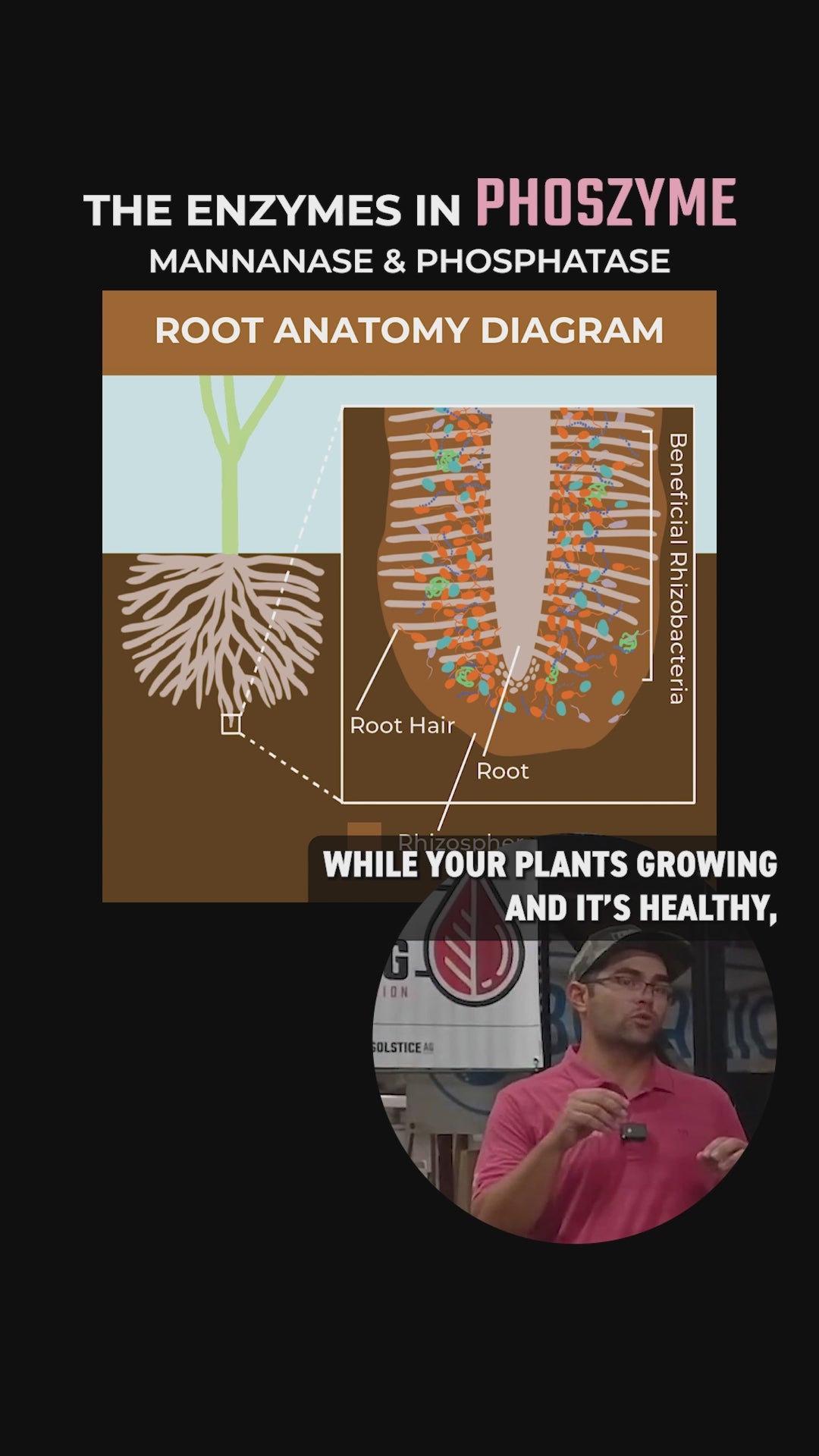 PhosZyme is a performance-enhancing biostimulant containing mannanase and phosphatase enzymes with mono ammonium phosphate. Mannanase enhances water activity and uptake. As the plant rhizosphere naturally exudes starches to drive water into the xylem, mannanase breaks down these starches, increasing the osmotic potential and enhancing water uptake. As more sugars are released back to the plant, this increases root growth and boosts microbial activity. Phosphatase frees up phosphorus that is bound to cations in the substrate. When applied to the substrate, it weakens the bonds between phosphorus and its companion ions, rendering previously inaccessible fertilizer immediately plant bio-available. This increases the uptake and availability of phosphorus.